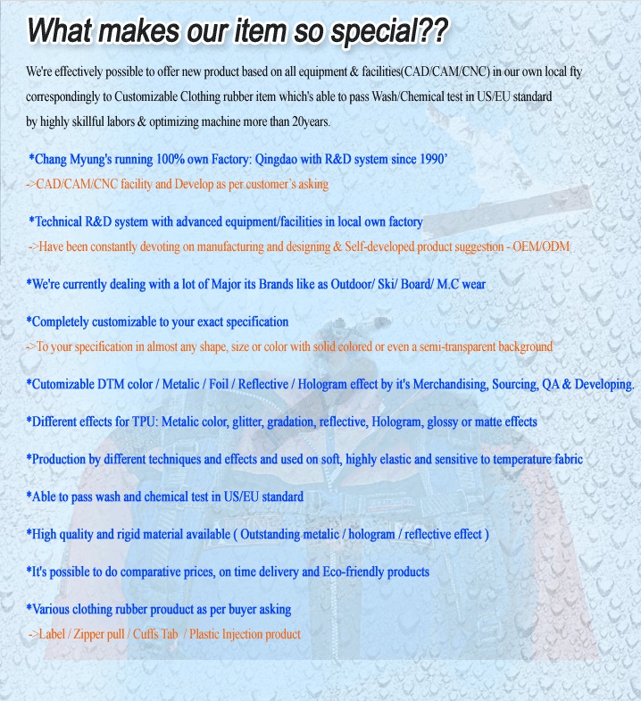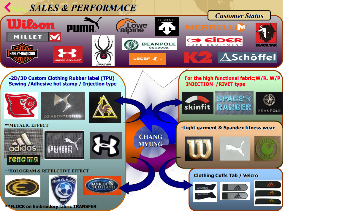 CHANG MYUNG. CNG are a manufacturer of accessories logos for garment/bag using non-toxic TPU (Thermoplastic Poly Urethane) with acquisition of manufacturing patents. Our accessories logos (such as label, patch, trim, logo wappen, zipper puller and Velcro tab) have 3-dimension metallic effect, and are manufactured through our own equipment, technology and R&D facilities in China. The applications of our accessories logos are for garments, bags, shoes and outdoor clothing etc.